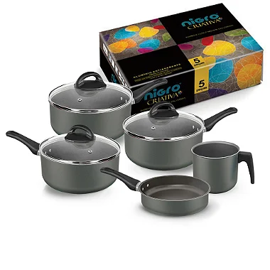 Composição: 1 panela 16, 1 panela 18, 1 panela 20, 1 frigideira reta 20cm e 1 caneca 14cm.